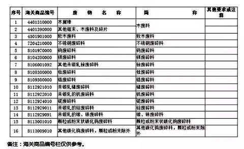 二、将不锈钢废碎料、钛废碎料、木废碎料等16种固体废物调整为禁止进口,自2019年12月31日起执行。